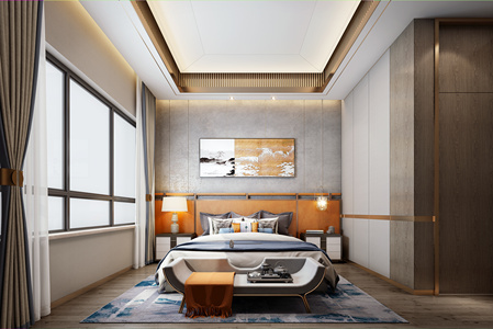 现代样板间卧室双人床床尾凳踏