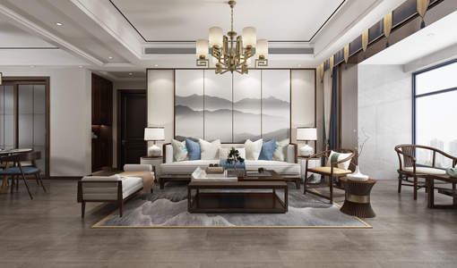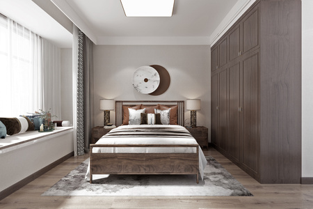 新中式卧室,双人床,床头柜,挂件,衣柜,