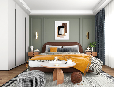 北欧现代轻奢卧室双人床,床尾凳,床头柜