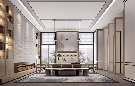 H05-0723新中式日式茶室茶桌椅书柜山脉山形软包墙面背景