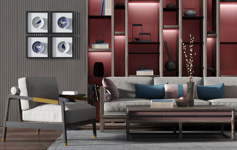 H09-0717新中式沙发单人沙发茶几鼓凳书柜挂饰挂件