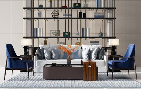 H05-0717新中式沙发茶几休闲椅子金属书柜书架台灯摆件