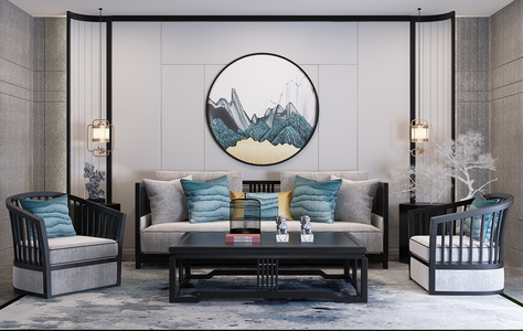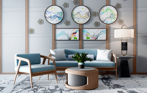 H12-0717新中式沙发茶几椅子圆形挂画装饰画台灯