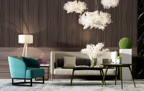 H06-0717新中式沙发茶几单人沙发圆形背景墙松树树枝小吊灯