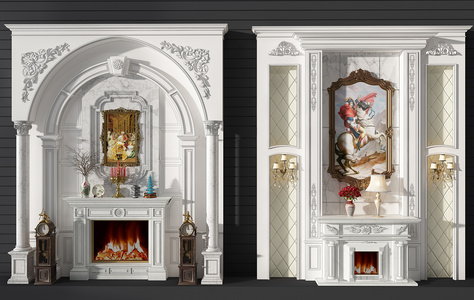 Z03-0708古典欧式法式雕花护墙板罗马柱壁炉画框镜框摆钟电视背景壁炉留声机电视柜