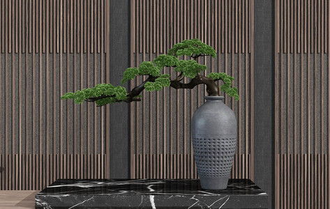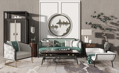 H13-0529新中式客厅沙发茶几单人休闲沙发装饰柜花瓶松树陶罐