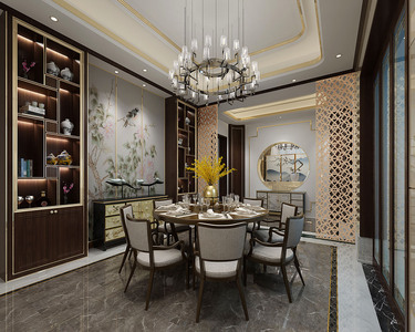 Z25-0507新中式别墅餐厅圆形餐桌椅餐边柜吊灯