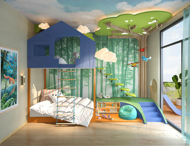 Z01-0510现代丛林主题儿童房上下床软梯树造型
