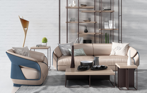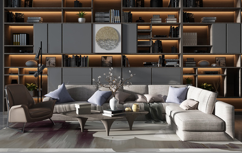 现代转角沙发茶几单人休闲椅子书柜组合