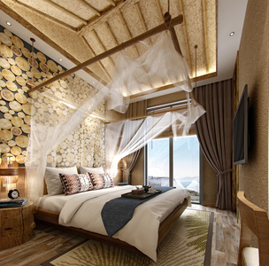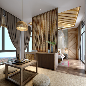 012新中式东南亚民宿酒店客房大床房 竹筒竹竿架子床窗幔纱帘木墩茶几沙发麻绳编织屏风隔断