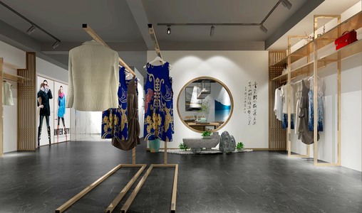 H14-0510中式服装服饰专卖店店面中式景观小景服装货架