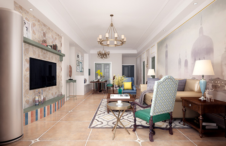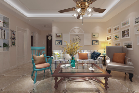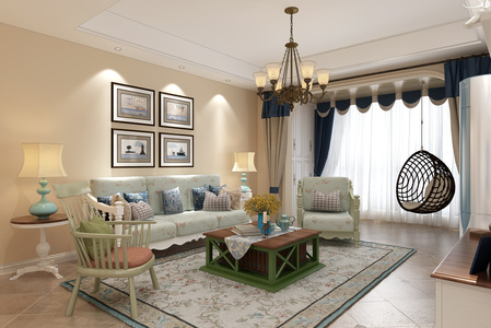 H11-0618美式田园客厅沙发茶几吊灯窗帘