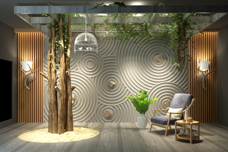 Z10-0604新中式日式石头禅意墙木头藤藤蔓植物类休闲椅沙坑组合干树枝