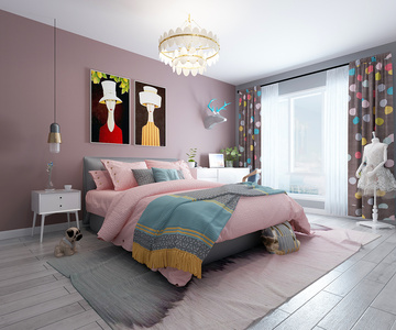 H01-0525现代儿童房 女孩房双人床 床头柜 边柜 地毯吊灯
