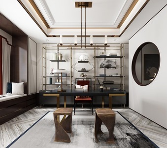 Z01-0402新中式书房书桌椅异形凳子书柜书架