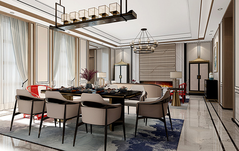 Z05-0215新中式客餐厅餐桌椅吊灯沙发茶几装饰柜