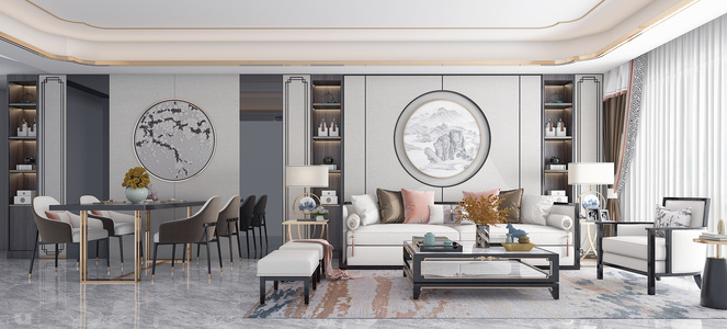 新中式客厅餐厅,沙发茶几餐桌椅
