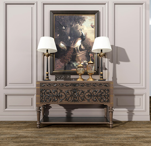 欧式古典雕花装饰柜、台灯、挂画,玄关柜
