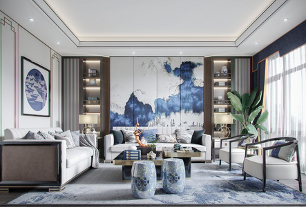 19新中式风格客厅,沙发茶几单人沙发,窗帘