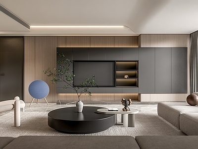 现代大平层客厅_沙发茶几组合_书桌椅_雕塑摆件_绿植盆栽_书柜