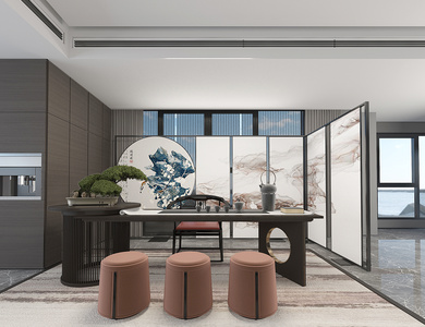 新中式茶室,茶桌椅,茶台盆景屏风