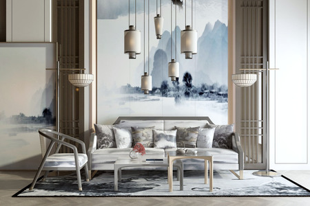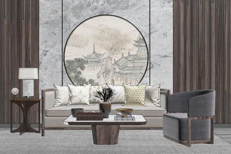 192新中式沙发茶几组合,水墨山水画中式背景墙,格栅,吊灯,单人椅,摆件组合,抱枕靠垫