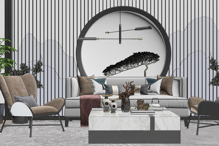198新中式禅意沙发茶几组合,水墨山水画中式背景墙,格栅,单人椅,盆栽绿植