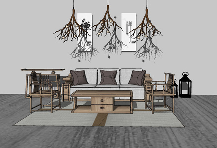 194新中式实木禅意沙发茶几组合 实木单人椅,边几摆件,树枝树杈吊灯