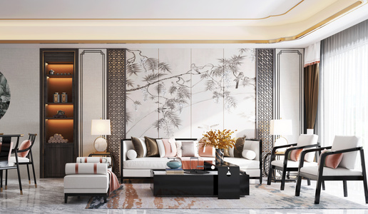 新中式客餐厅,沙发,餐桌椅,茶几