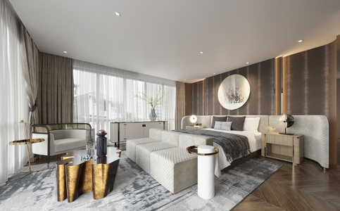 别墅卧室,双人床床尾凳,茶几边几单人沙发