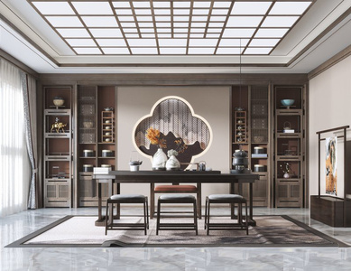 新中式风格茶室书房,书桌椅茶台书柜