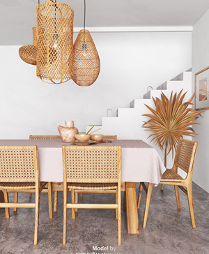 自然风民宿,藤编编织餐桌椅,椅子吊灯