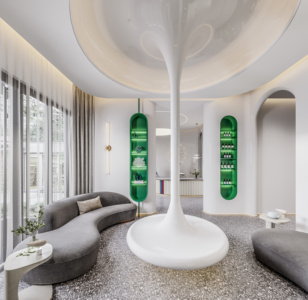02_理发店,前台,接待台,休息区,异形沙发,壁灯,金属人物雕塑落地装饰灯,理发区,理发皮座椅,洗手池台盆,带轮子的圆凳,柜子,墙饰,立体花