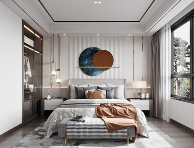 03 新中式轻奢卧室,床头小吊灯,床头柜,双人床,尾等,墙饰,立体画,地毯,台灯,衣柜,衣橱,