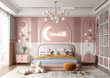 29现代轻奢女儿房,女孩儿童房,床头柜,圆凳子,玩偶,双人床,球形吊灯,衣柜,衣橱,绒面圆凳,地毯