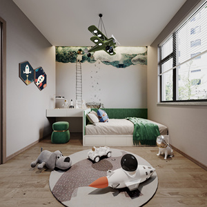 35现代儿童房,男孩儿房,玩偶,飞机模型吊灯,方形布面凳,玩具,儿童地毯,