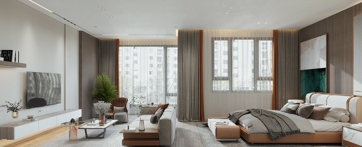 05现代卧室 ,双人床,床尾凳,地毯,墙饰,挂画,装饰画,床头吊灯,台灯,靠包,抱枕,沙发座椅,茶几,边几,角几,圆几,绿植,花瓶
