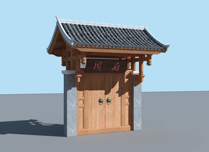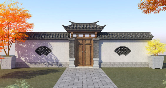 中式大门,门头,围墙院墙,树,