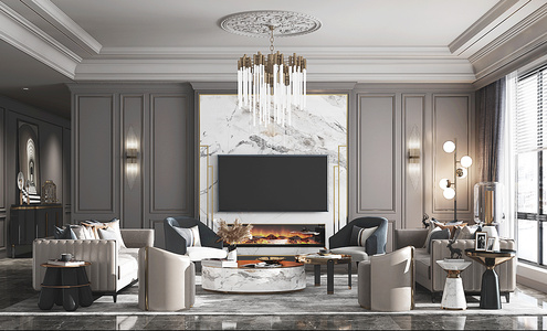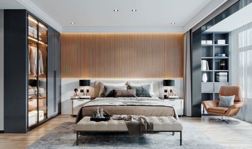 新中式主卧室,双人床,床尾凳,休闲椅书柜