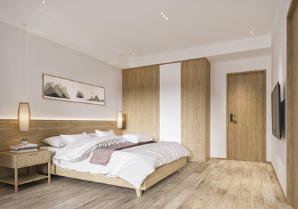 日式现代自然风,民宿主卧,双人床,床尾凳