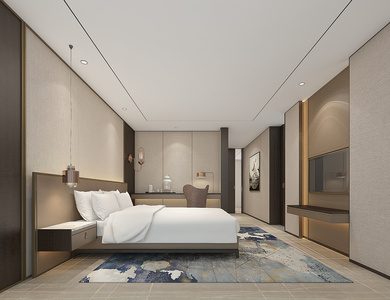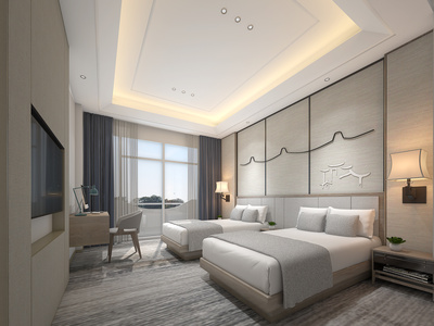 现代酒店客房套间,双人床,标准间,衣柜,梳妆台
