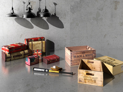 LOFT木箱子,皮箱行李箱,吊灯工矿吊灯,棒球棍,手套