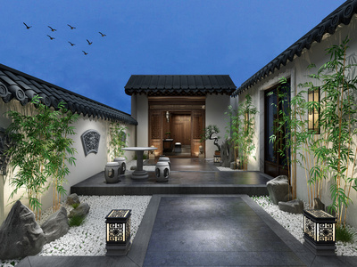 10新中式庭院景观,茶室茶楼,庭院石灯,中式院墙,大门门头石头桌椅石头竹子