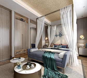 013新中式酒店客房卧室架子床窗幔茶壶床头柜双人床cr材质