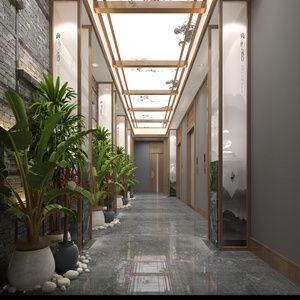 H02-0419新中式餐饮餐厅走廊植物盆栽