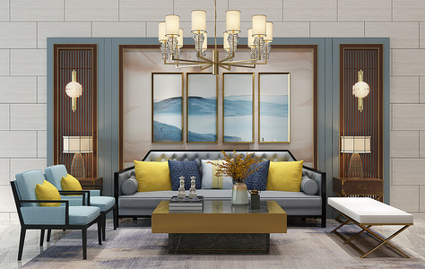 H08-0115新中式客厅沙发茶几窗帘躺椅摆件