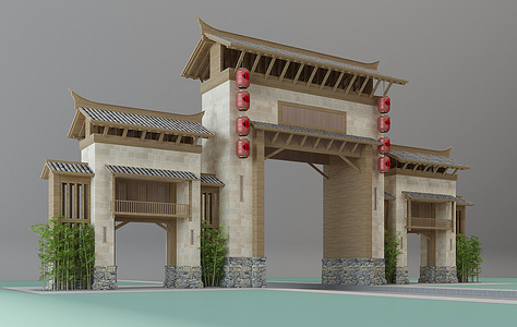 H37-0103中式门楼大门牌楼度假山庄村灯笼