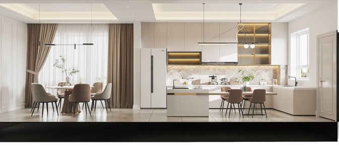 01法式奶油风客餐厅,厨房橱柜中岛岛台开放厨房,现代沙发茶几