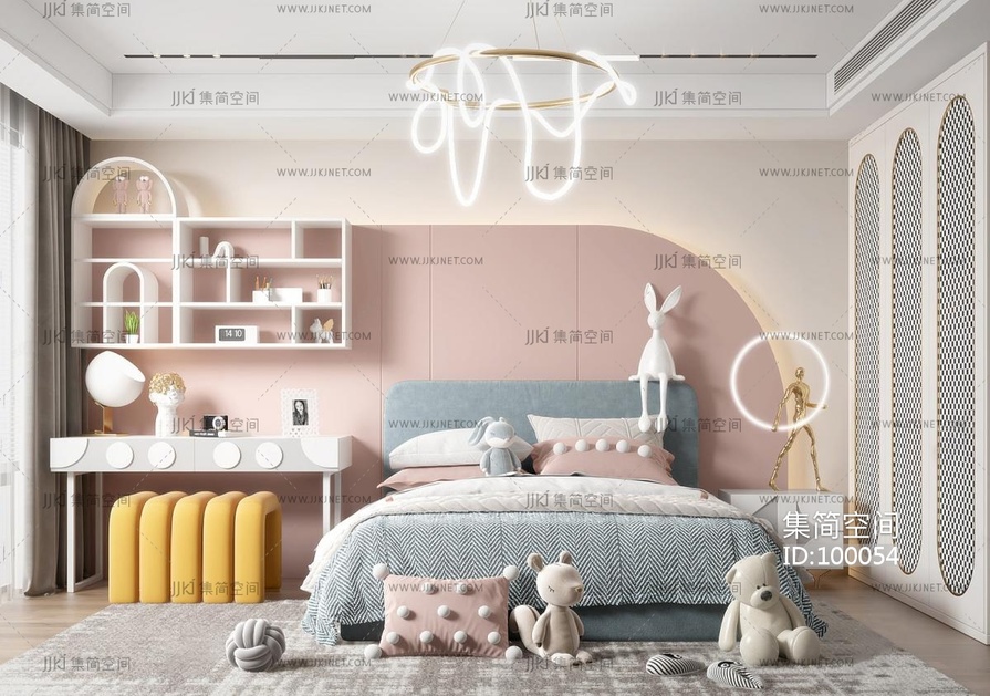 SY03-现代儿童房,女孩房,女儿房卧室,管形吊灯,玩偶,摆件,梳妆台 3d模型下载 [模型ID:100054]