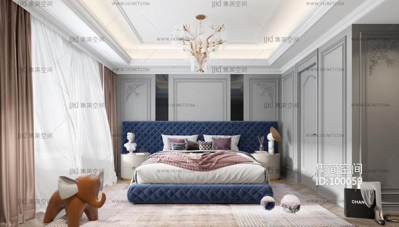 SY08-法式欧式主卧室,皮革双人床床头柜,树枝造型艺术吊灯,摆件,雕塑 3d模型下载 [模型ID:100059]